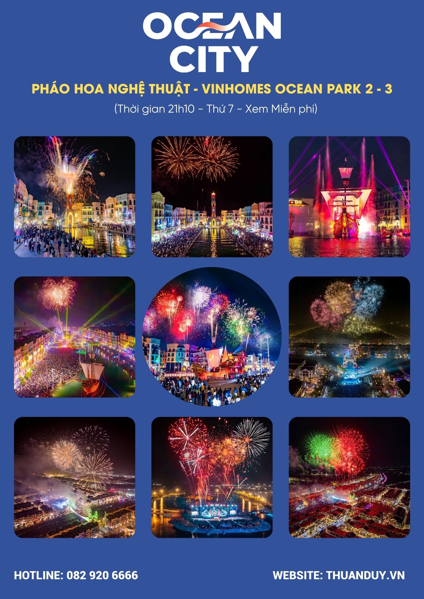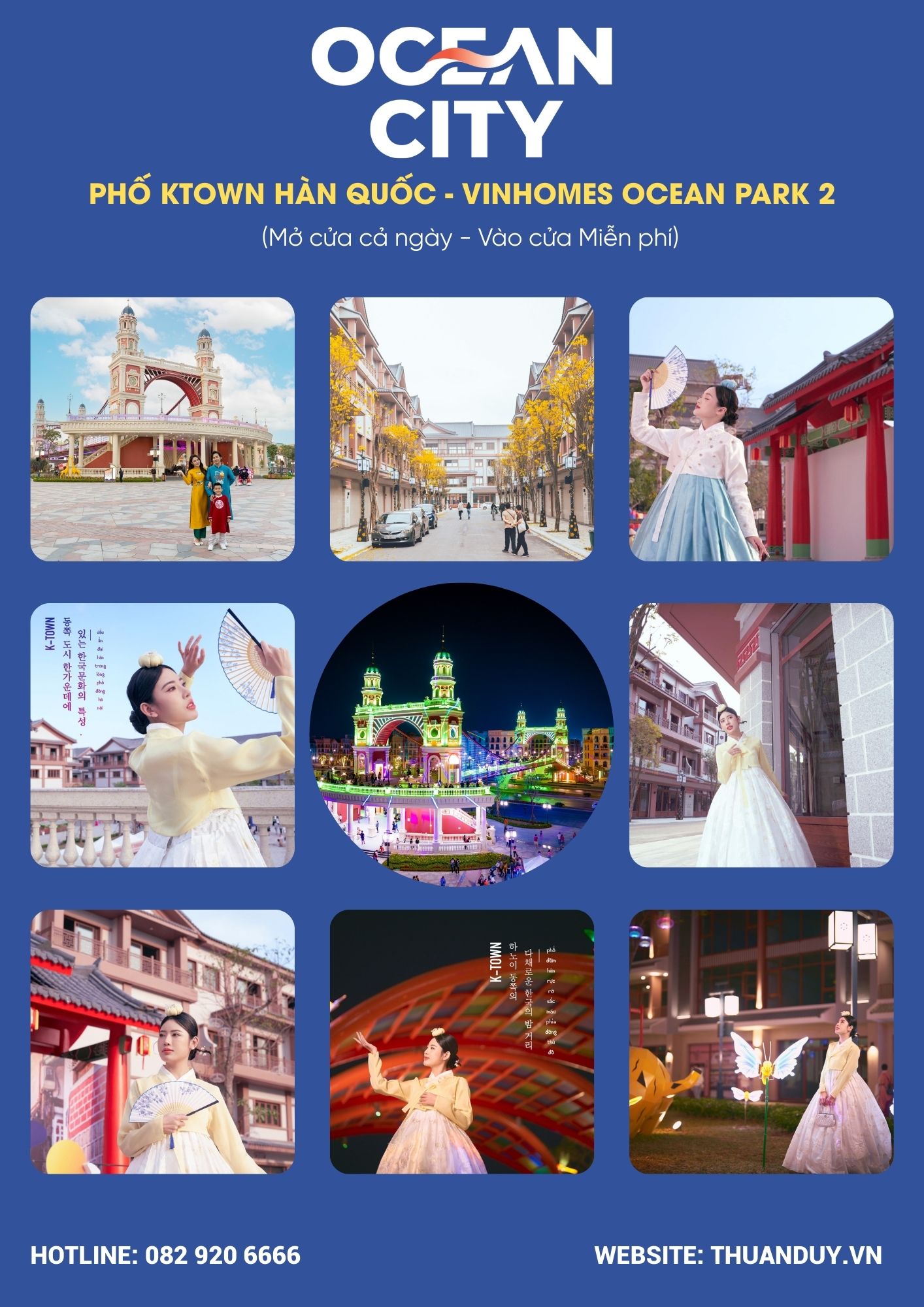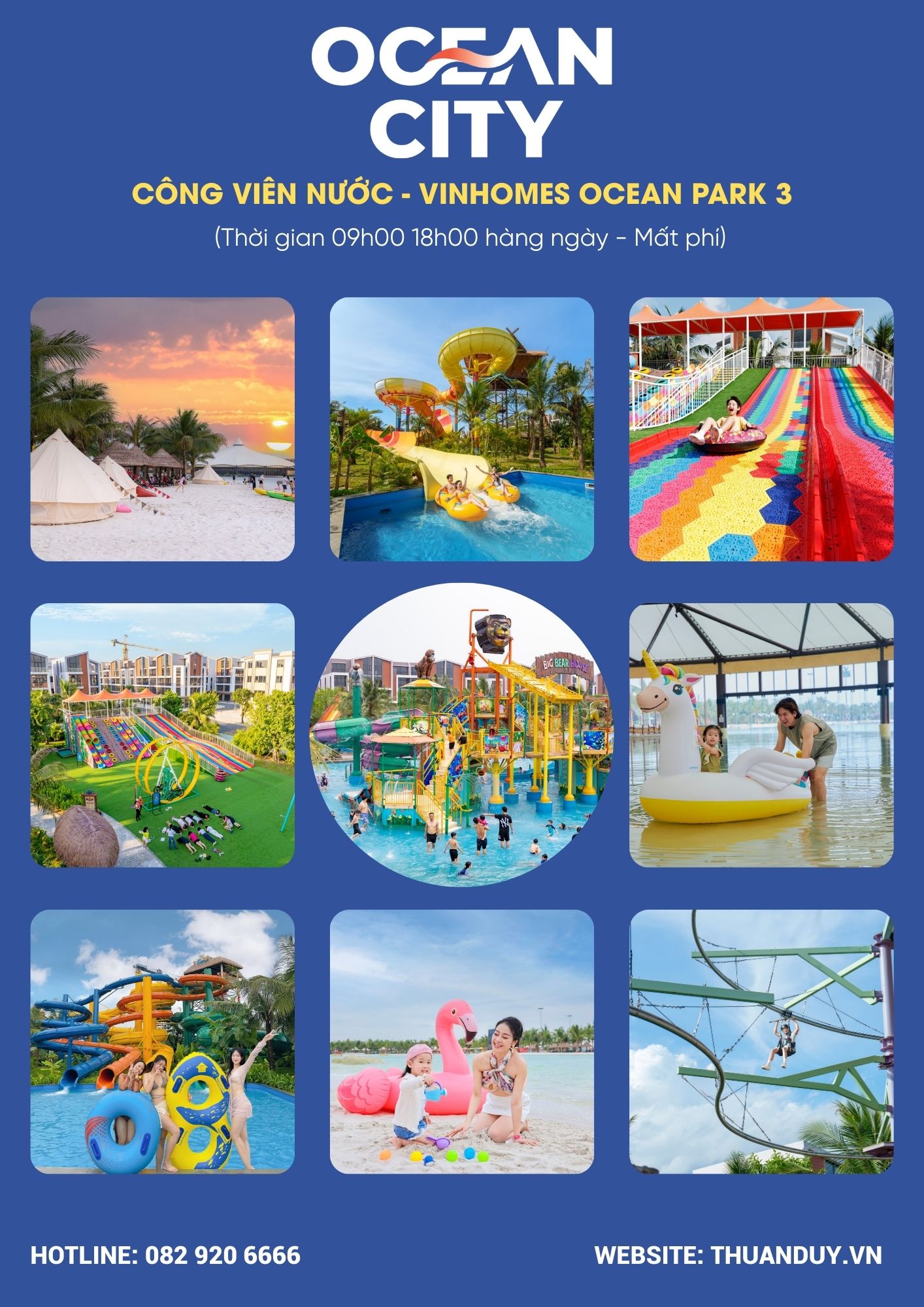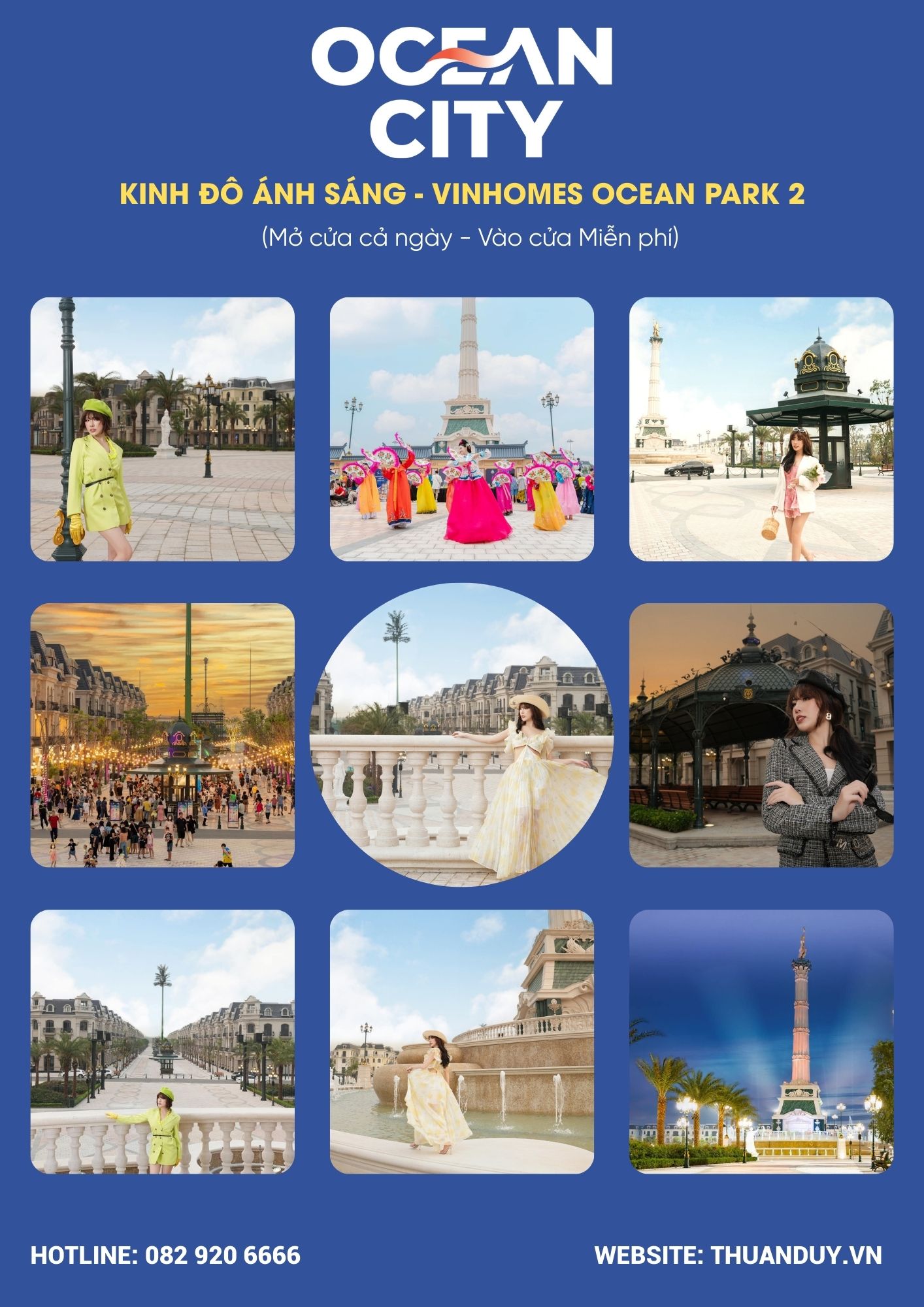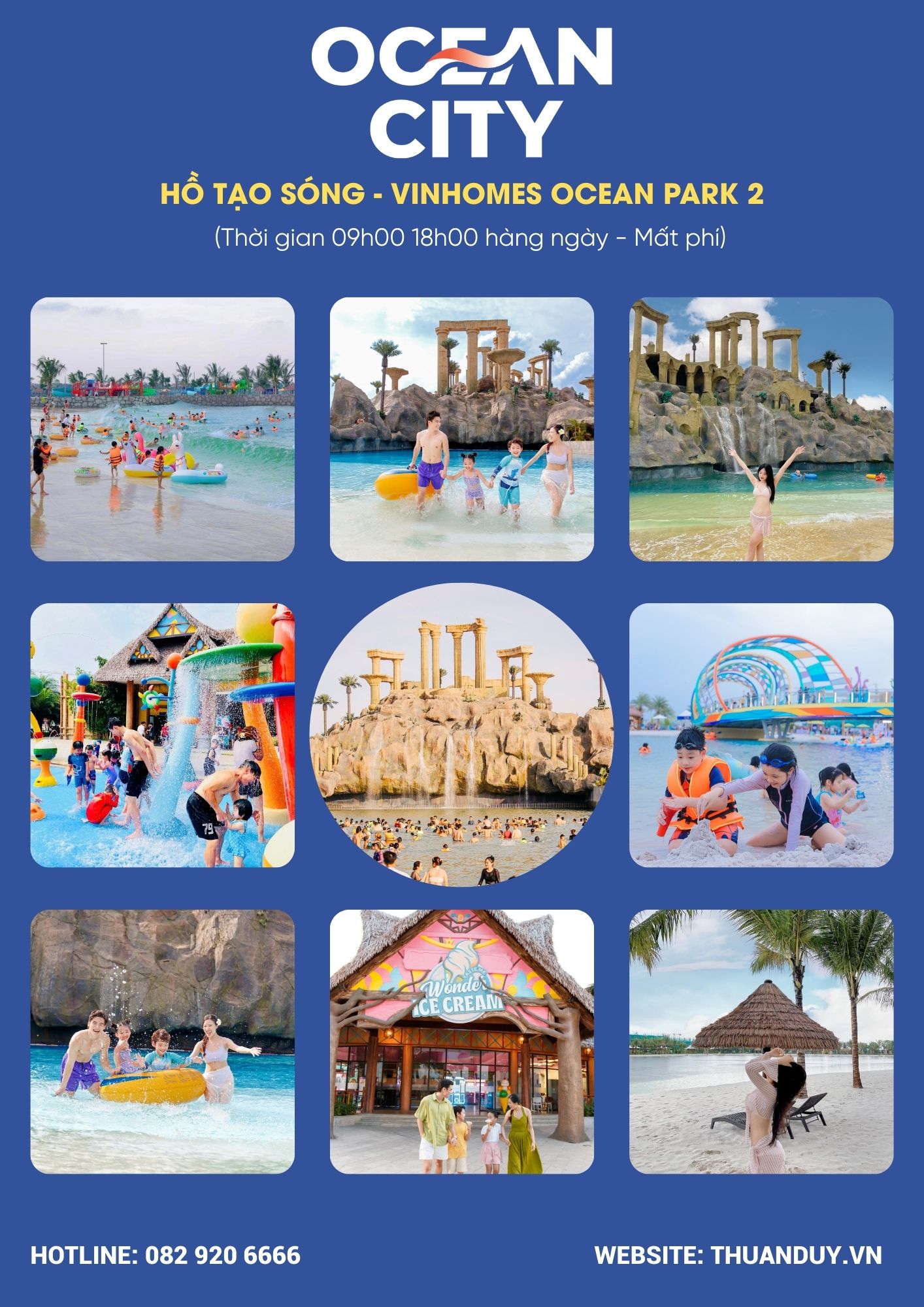 Ocean City là tổ hợp vui chơi – giải trí – nghỉ dưỡng “tất cả trong một” ngay gần Hà Nội, quy tụ: phố đi bộ Venice, KTown (phong cách Hàn), Little Hong Kong, Làng Sake Nhật, Công viên nước (OCP3), Hồ tạo sóng (OCP2), show nhạc nước Grand Voyage, pháo hoa nghệ thuật, công viên nội khu xanh mát cùng hệ thống homestay đa phong cách và dịch vụ BBQ bên hồ. Di chuyển nhẹ nhàng bằng xe tuk tuk điện nội khu – gọi nhanh 082 920 6666.